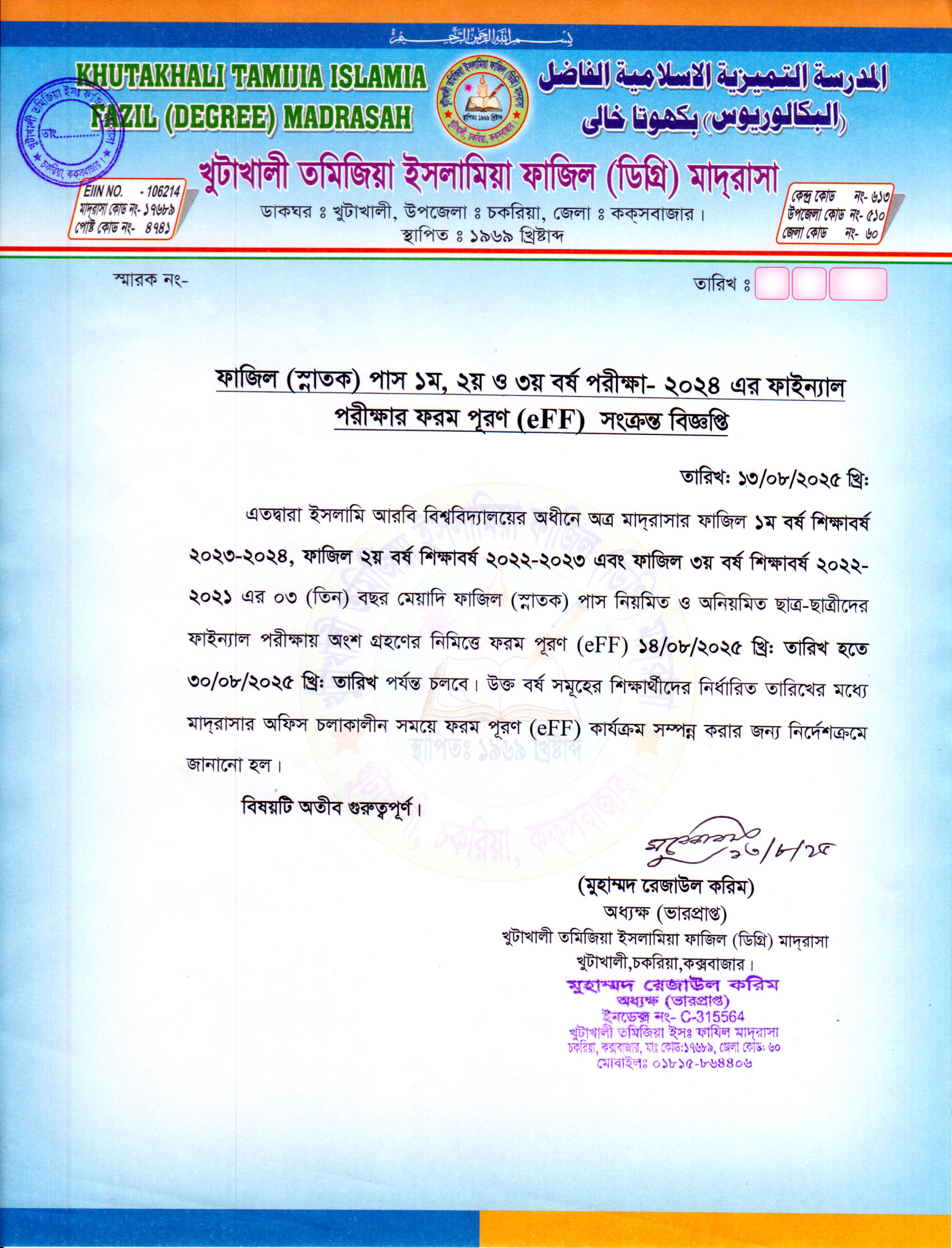 13/08/2025 ফাজিল (স্নাতক) পাস ১ম, ২য় ও ৩য় বর্ষ পরীক্ষা- ২০২৪ এর ফাইন্যাল পরীক্ষার ফরম পূরণ (eff) সংক্রান্ত বিজ্ঞপ্তি