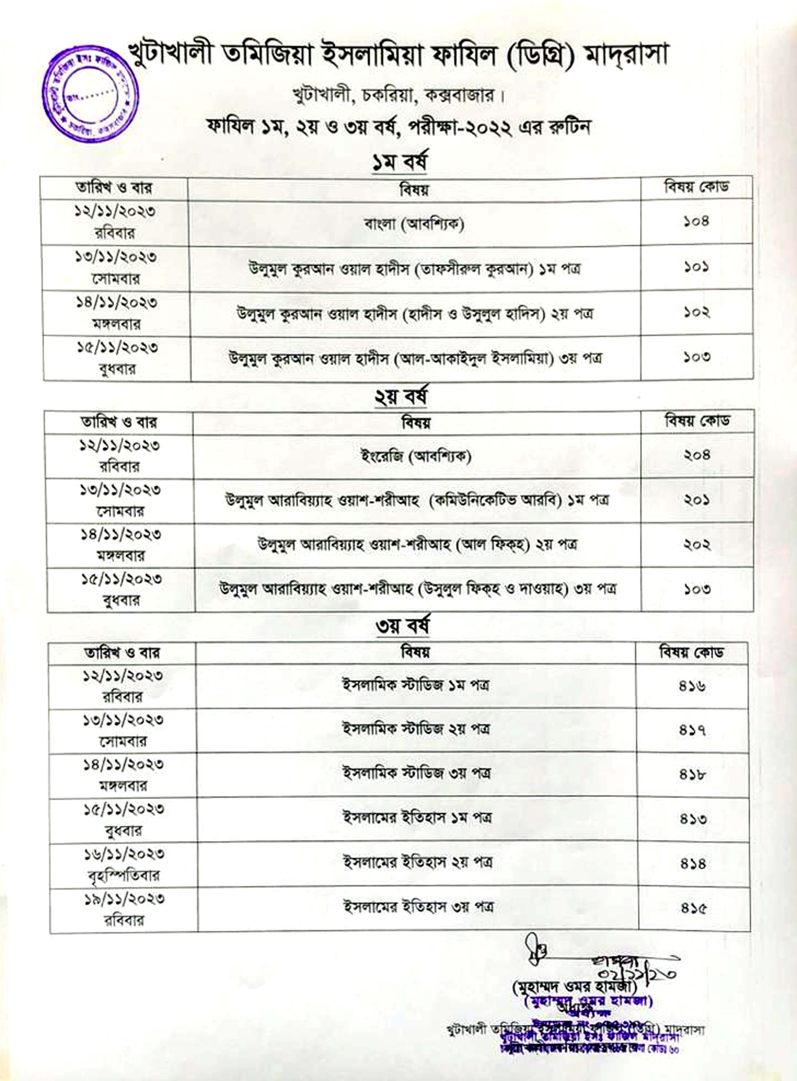 11/02/2023 ফাজিল (স্নাতক) পাস ১ম, ২য় ও ৩য় বর্ষ নির্বাচনী রীক্ষা-২০২২ এর সময় সূচি