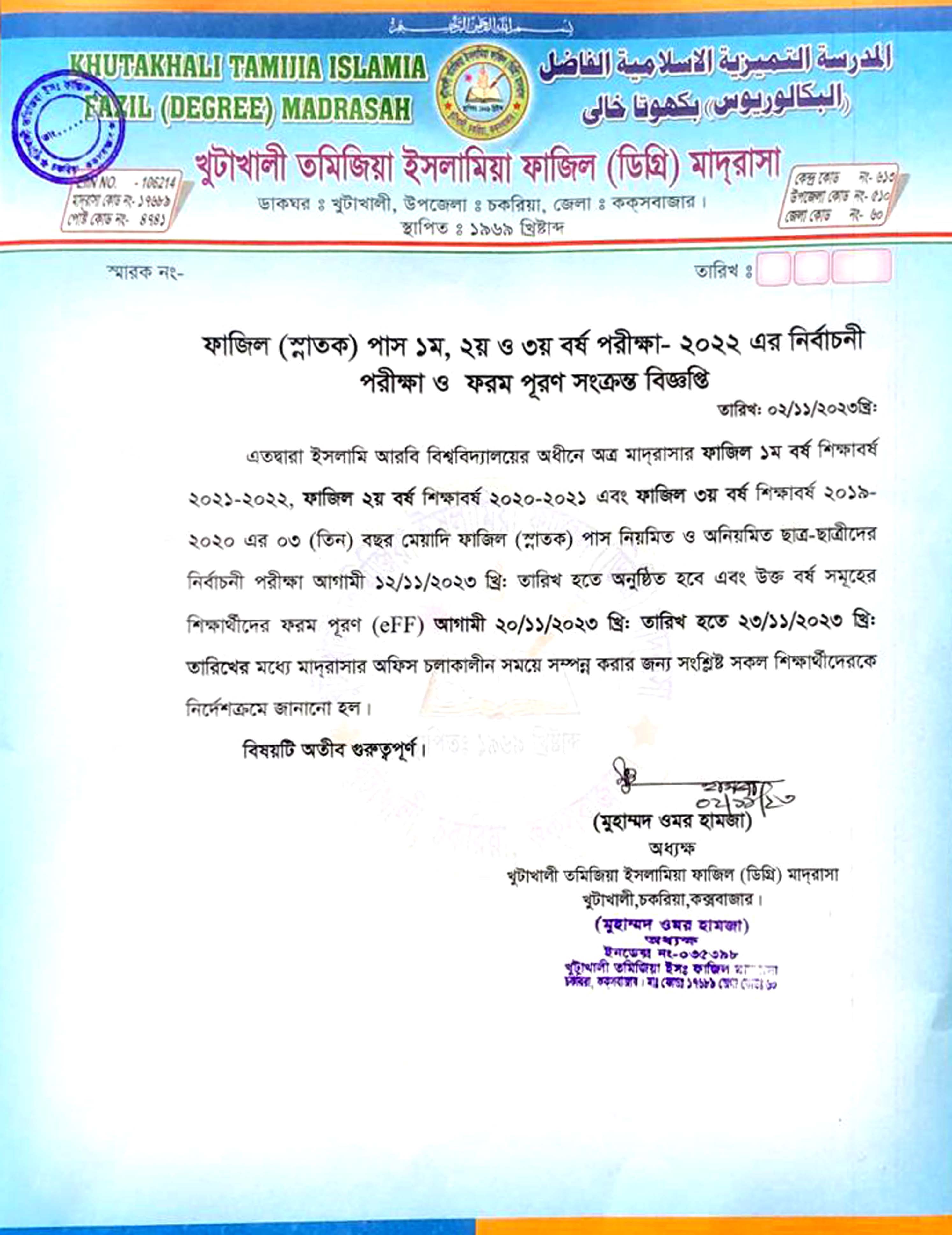 11/02/2023 ফাজিল (স্নাতক) পাস ১ম, ২য় ও ৩য় বর্ষ পরীক্ষা-২০২২ এর পরীক্ষার্থীদের ফরমপূরণ সংক্রান্ত জরুরী বিজ্ঞপ্তি