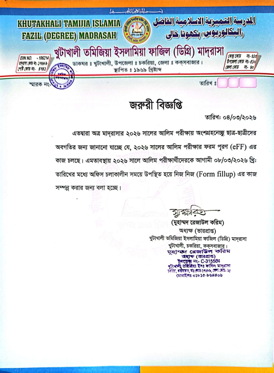Madrasha Code : 17689 Khutakhali, CHAKARIA, Cox'sbazar; 01309106214