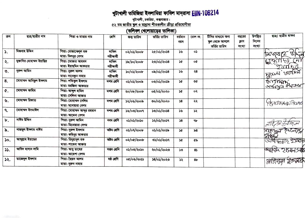 01/24/2024 ৫২ তম জাতীয় স্কুল ও মাদ্রাসা শীতকালীন ক্রীড়া প্রতিযোগিতা ভলিবল খেলুয়ার্ডর তালিকা।