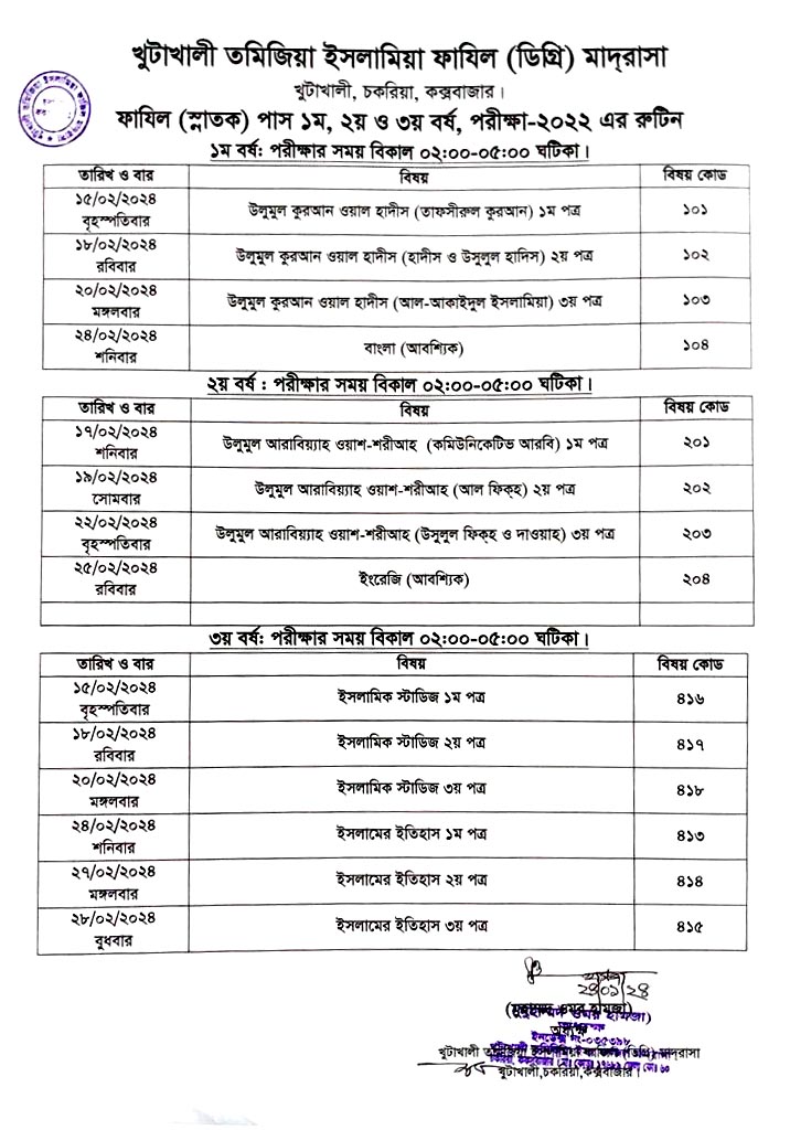 01/24/2024 ফাজিল (স্নাতক) পাস ১ম, ২য় ও ৩য় বর্ষ নির্বাচনী রীক্ষা-২০২২ এর সময় সূচি